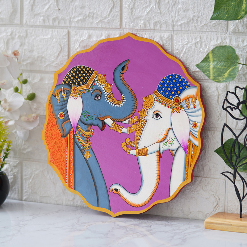 Pichwai Painting: A beautiful pichwai painting of two elephants standing next to each other on a purple plate